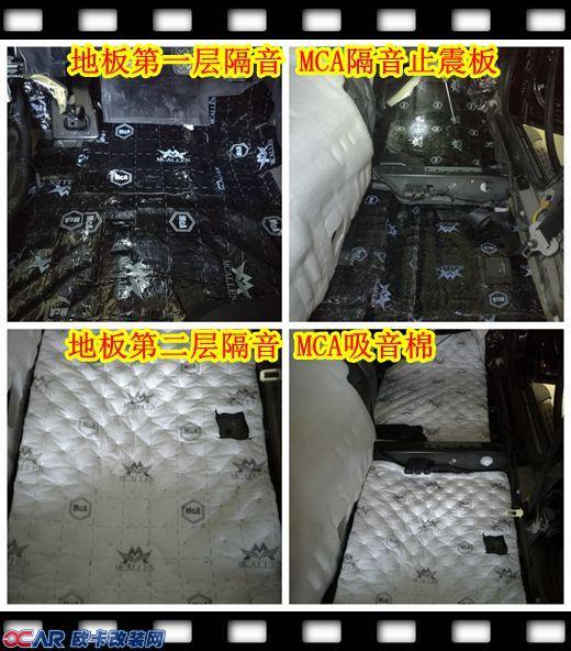 首先是对地板的隔音降噪处理,地板前端是距离发动机最近的部位,并且也是离驾驶员最近的部位,此处隔音后效果表现最为明显,能够降低发动机噪音亦能减少路噪和胎噪的传入。整个车的地板只的薄薄的一层铁皮,行驶中由于路面路况的不同,很容易产生噪音,并由此传入车内,因此对地板进行双层隔音MCA隔音止震板,MCA隔音吸音棉。第一种材料能够很好的隔绝噪音的传入,还能增强汽车的钣金强度,抑制因金属疲劳与车身扭动而生成的杂音,及由轮胎传入的路面噪音。第二种材料是MCA隔音吸音棉,与第一种材料配合使用,粘贴在止震板上消除空腔共鸣,更好的吸收各种噪音。
