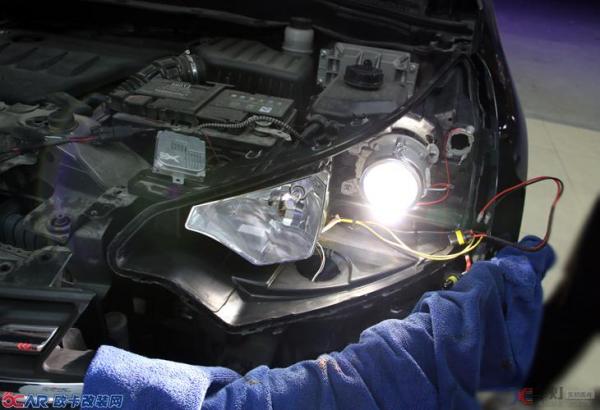 向车主确定好改装方案后,我们的技术师傅三下五除二便把车灯拆卸下来了。拆大灯的时候师傅会用毛巾把大灯周围给包围起来,以免拆大灯时不小心刮花。