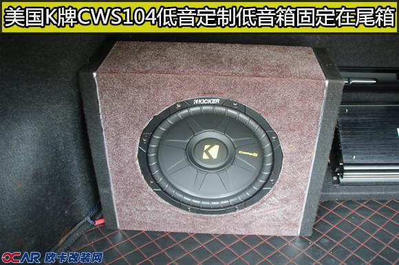 5、超低音:大部分原车音响没有低频,之所以要加装超低音?超低音也属于喇叭发音体,且每个喇叭所负责的频率是不一样的,像高音的频段是8kHz-20kHz,中音500Hz-8kHz,低音500Hz-40Hz。若果没有超低音,当乐器像大鼓、管风琴、大提琴、贝斯等乐器发声处于低频的频段由其他喇叭发音,就会失真。汽车音响只有各个频段均衡,喇叭的发音才是完整的。超低音选择的是美国K牌CWS104十寸低音,固定安装在后尾箱