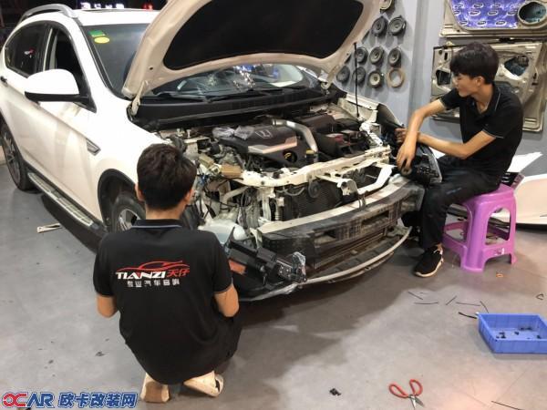 纳智捷U6的车主感觉原车卤素灯亮度不够用,尤其是晚上开车,完全都看不清路面状况,所以下定决心来到汕尾天仔音响改装店将大灯给换了。