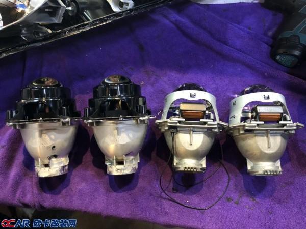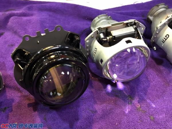 拆下的原车普通单光透镜和即将安装的GTR双光高清透镜,黑色的是原厂的普通单光透镜,右边的是我们改下去的双光透镜。