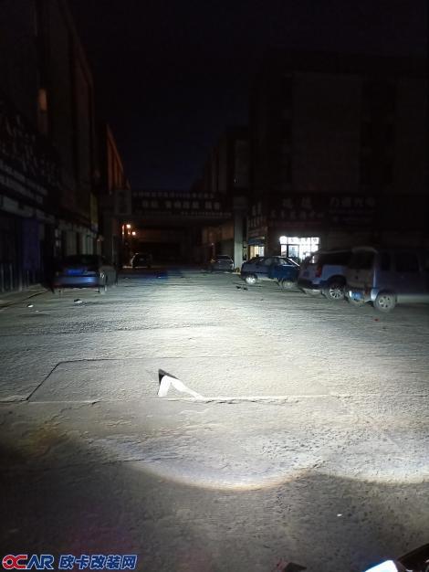 这是单独开夜行,和大灯远近光的效果,恶魔眼粉色配绿色,加上蓝色的也行,着实很抢眼,隔着千万辆车,就像一眼看见最爱的你,但话说回来,改灯嘛,当然并不是一味的想改变灯的颜色,最重要的还是要求灯光的效果,那咱们就看下路面效果