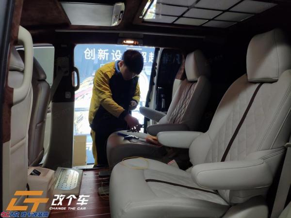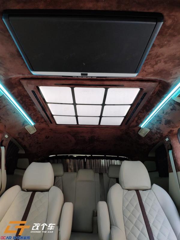 改装项目:①仪表台、门板、桌板包覆②侧壁绒布包覆③吸顶电视④定制专用脚踏⑤304不锈钢窗檐修饰条⑥主、副驾座椅软包⑦航椅两张(通风、加热、按摩)⑧沙发床一个⑨顶棚、立柱、遮阳板翻毛皮包覆⑩迈巴赫顶灯⑪主副驾扶手车载冰箱⑫86盒(电源)+220V插座⑬电动中门改装(左右侧滑门)⑭电尾门改装⑮游艇木木地板⑯全车隔音⑰全车隔音⑱不锈钢门槛