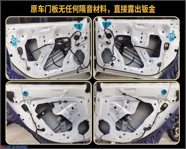 为了保证汽车音响效果能够更好的发挥,首先要为音响提供一个有利的工作环境,要对四门进行汽车隔音减震处理。原车门板无任何隔音材料,直接露出钣金,高速行驶时容易产生钣金共振。