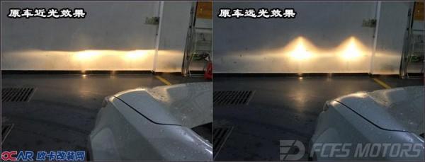 原车近光、远光效果:如图所示,近光灯光光线暗淡,分布不均匀,切线不明显,远光灯,光源直接表现为两个光团,模糊不清,路感极差,在夜间行驶中,人眼处于高度紧张状态,亮度不合理,容易引起视觉疲劳,而过于昏黄的灯光则会令驾驶者昏昏欲睡,危险可想而知!!!