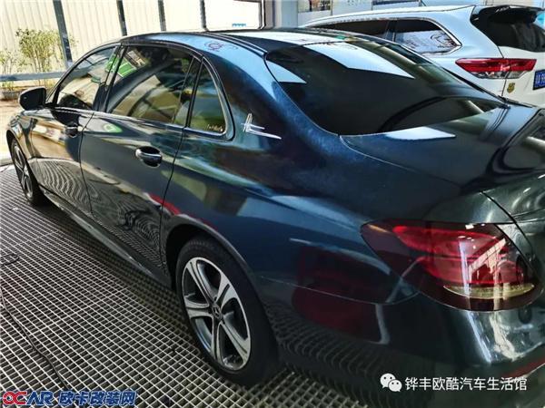 奔驰E级原车为黑色,车主觉得单纯的黑色有一些老气,于是选择贴改色膜,换一个颜色,换一个心情。