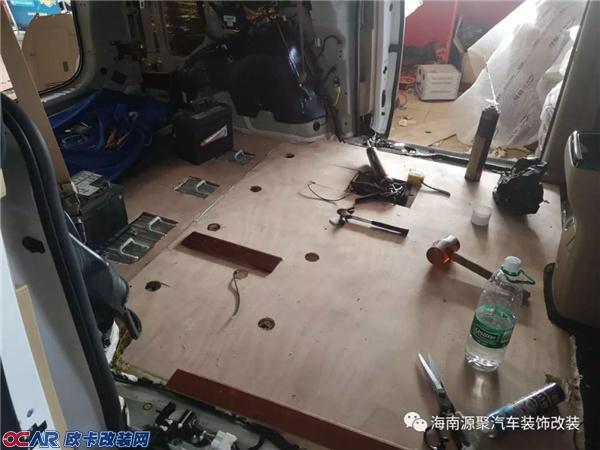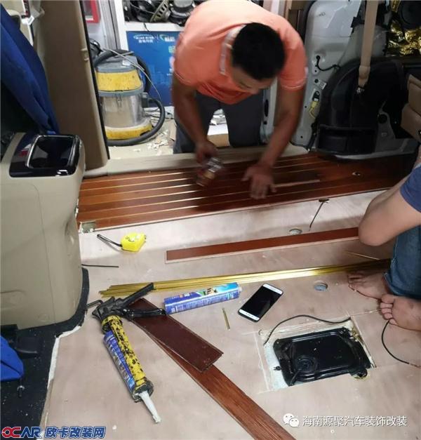 地板内饰升级的第一步是打底。如果直接把游艇柚木实木地板安装在底盘上,第一不能够保证底盘的平整性,第二其承压能力也比较弱,难以保证游艇柚木实木地板的使用寿命。所以先使用高档木板做了第一层的固定处理,做好打底的工作。