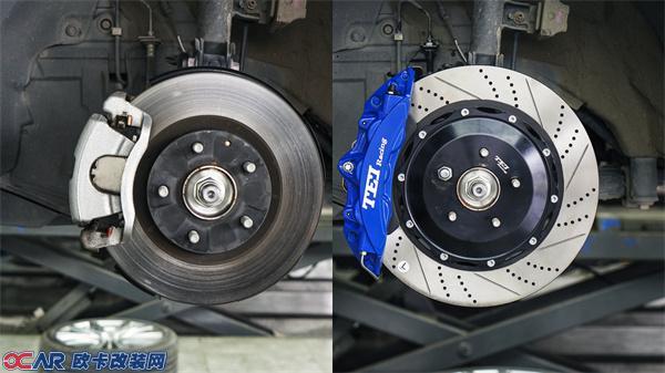 阿特兹车主花了不到一个月工资8k不到,升级前轮改装TEI Racing P60NS街道性能大六活塞刹车卡钳套件,原厂19寸轮毂搭配378x32mm打孔纹分体盘。原车是一个双式活塞卡钳搭配一个296的实体心碟盘,升级前后两者对比一下差别还是很大的。原车刹车碟尺寸小,摩擦面积小,盘面没有花纹增加摩擦系数,最重要的是,原厂碟是实体碟,没有通风槽散热,耐高温性能差,高速刹车安全系数低。