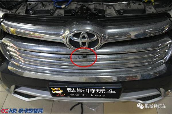 前视360行车记录仪摄像头改装在车标的正下方,信号线直接穿进驾驶室。