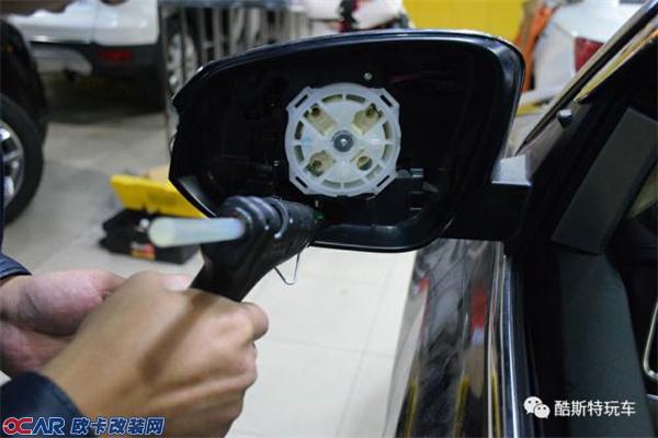 拆下来的右后视镜,用专业打孔工具打孔,左右后视镜各改装上一个360全景行车记录仪摄像头。