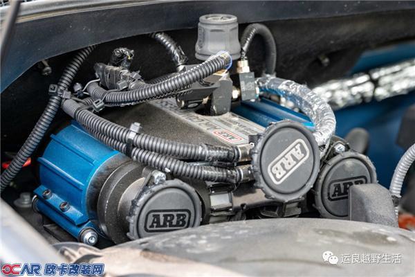 ARB双缸气泵就安装在了左上方的空间,除了能为轮胎充气外,它还是气动差速器锁的动力源泉。