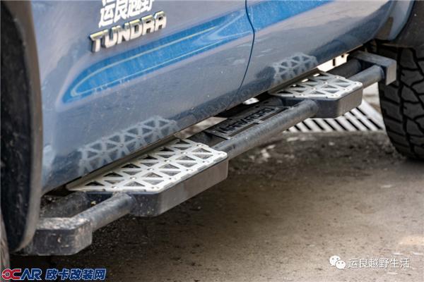 来到车侧,粗壮的MR侧杠提供了坚实的防护,这也是长轴距皮卡车型迫切需要的。同时,在前后上下车位置还预留了宽大的踩踏区域,并在表面设置了镂空的防滑纹路,不影响日常便利性。