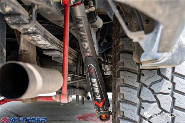 悬挂系统换装了K-MAN的FM58系列氮减,并进行了两寸升高。这套避振器可分别对压缩与回弹阻尼进行8段调节,能够根据车辆负载状态、不同地形,以及驾驶习惯进行更细致的调整。