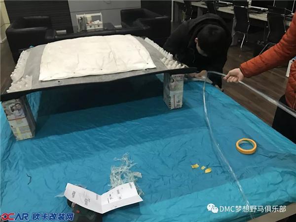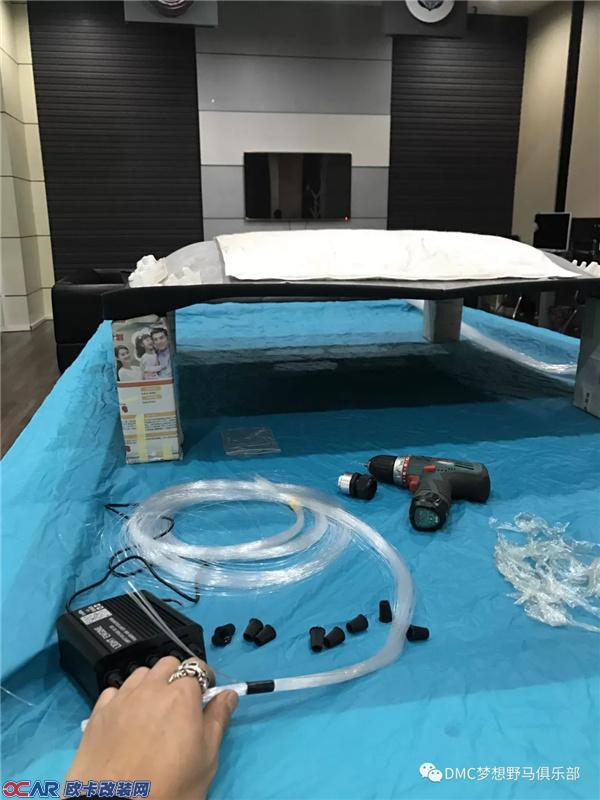 准备制作星空顶,临时征用了桌球案(大小高低都很合适)。首先将车顶安置好,要用的纤维线束也早就准备好了。