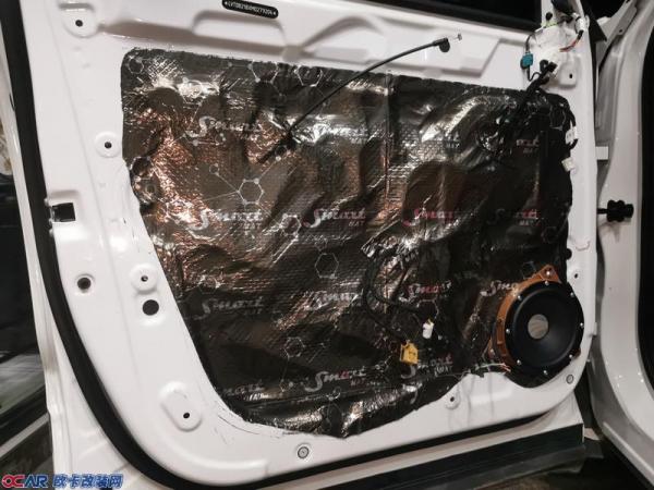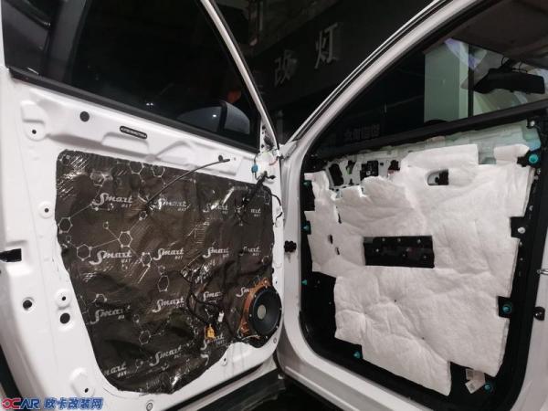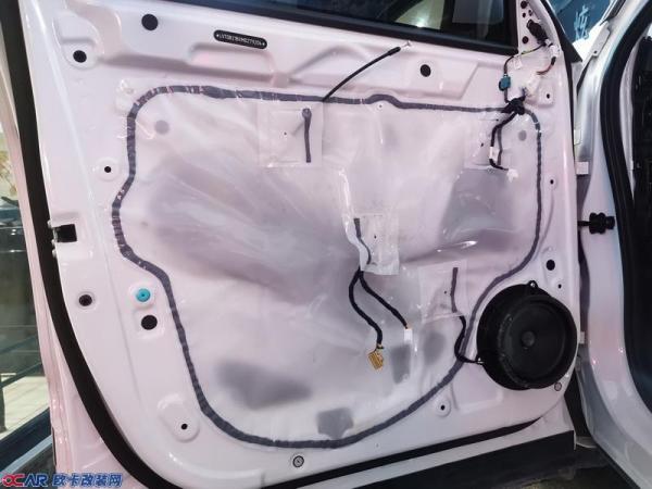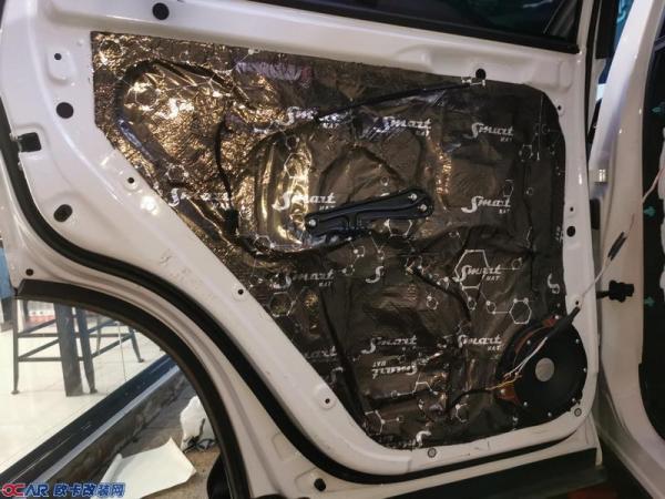 原车门板内部只用了一层简单的塑料薄膜,这很难起到良好的隔音效果。技师使用俄罗斯StP Smart减震板,对门板做双层止振处理,让门板形成一个密封箱体,有效减少噪声对音响品质的干扰。