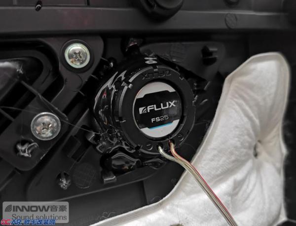 隔音完成后,技师将前声场喇叭升级为德国佛伦诗 sporty 260两分频,它的中低音单元使用的是玻璃纤维织物音盆,并使用了超厚的橡胶悬边进行保护,这使得其动态效果极佳;高音使用的是丝膜球顶设计,可以很好的拉高整体声场,让音乐显得更加通透。为避免对汽车原有线路做过多改动,技师将中低音单元安装在了汽车原位,高音单元则安装在了门板饰盖上。
