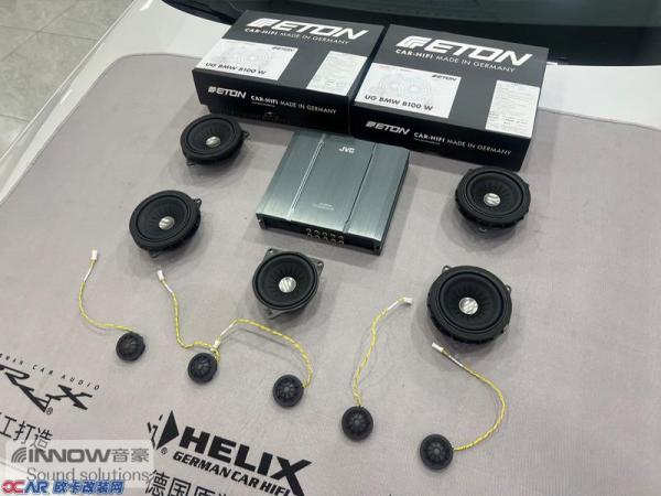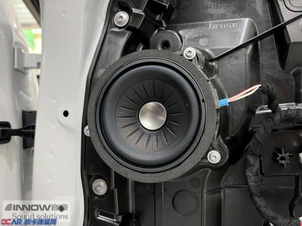 技师将前声场喇叭更换为德国伊顿 宝马专用中高音,将中低音单元安装在了门板原位,它的音盆振膜采用了精制松压纸盆,具有较好的响应效果,可以降低音源信号延迟,而高音单元安装在了门板预留的三角位置,一方面能够让前声场拥有更好的立体环绕效果,另一方面还做到了无损安装。