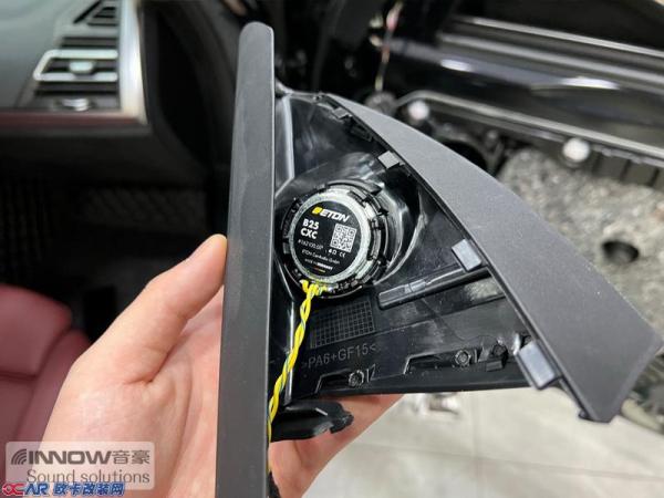隔音完成后,技师将前声场的中音单元替换成德国伊顿宝马专用中音,它采用了铝凹音圈设计,并使用了超厚的悬边进行保护,这使得中低音部分的表现十分沉稳;而高音则选用了德国伊顿宝马专用高音,它采用了丝膜球顶设计,可以让高频部分清晰细腻。为避免对汽车原有线路做过多改动,技师将其安装在了门板的三角位处。
