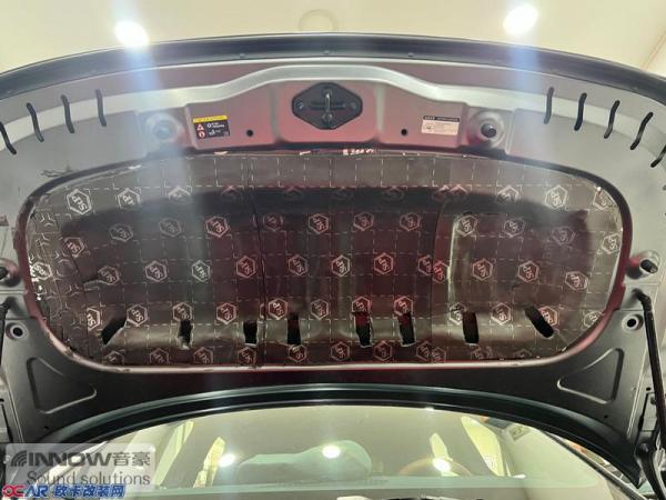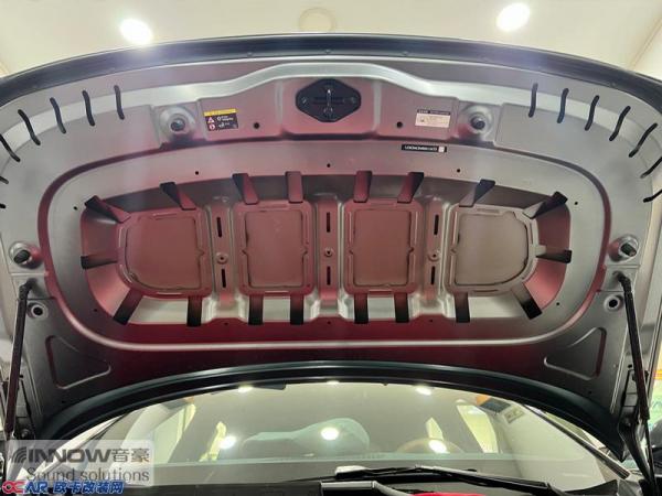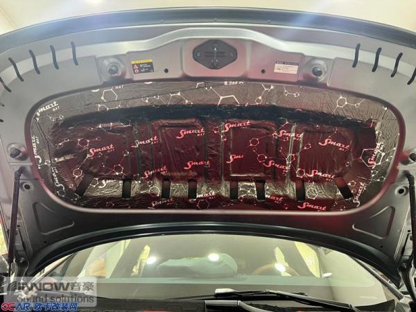 原车引擎盖只是一层铁皮结构,汽车行驶时引擎盖部位很容易产生振动噪声。技师先使用俄smart,对引擎盖做了止振处理,降低了该部位的钣金共振;再使用SLP04棉,对引擎盖做了隔音处理,减少了噪声的传播。