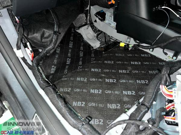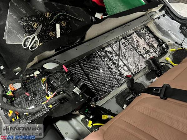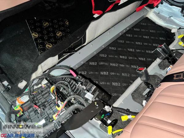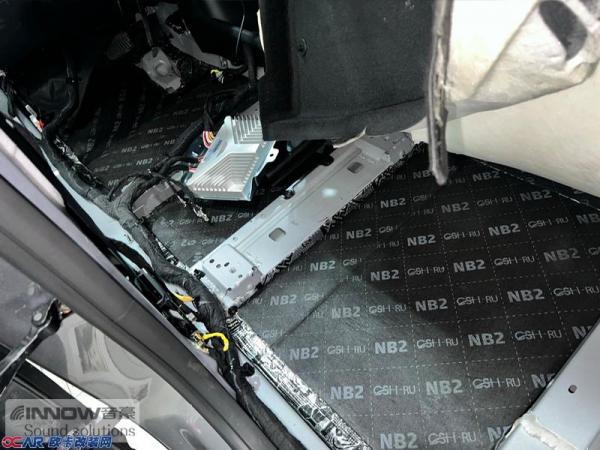 底盘是低频共振的重灾区,其中仪表下方还是前舱内各类噪声的主要传入路径。所以技师先使用CSH小炸弹,对底盘和仪表台下方做了全面止振处理,降低了低频共振的产生;再使用AC06棉对底盘和仪表台下方做隔音处理,减少噪声的传播;最后使用NB2棉做吸音处理,将残余噪声进一步吸收,让隔音效果更加理想。