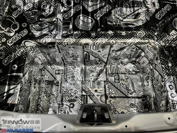 汽车的后备箱是一个空腔结构,这导致该部位很容易产生空腔共鸣,而且这种噪声会被无限放大。所以技师先使用CSH小炸弹和银卫盾,对后备箱做了全面止振处理;再使用NB2做隔音处理,在此基础上使用smart棉做吸音处理,充分减少了空腔共鸣的产生和传播。