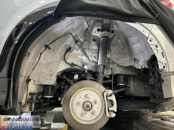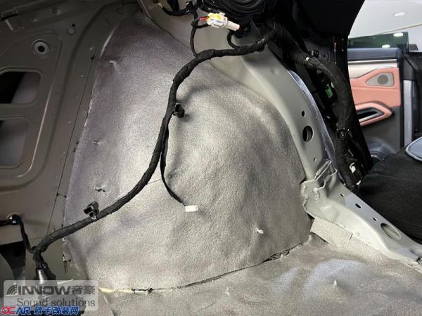 轮胎与地面摩擦会产生路噪和胎噪,此类噪声主要通过翼子板传入到车厢内部。技师在使用 CSH小炸弹,对四轮翼子板做了止振处理后,又使用smart棉,对四轮翼子板做了吸音处理,从而减少了路噪和胎噪的传入。