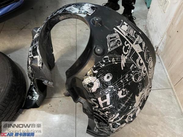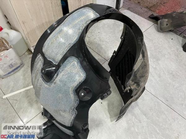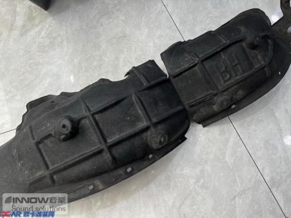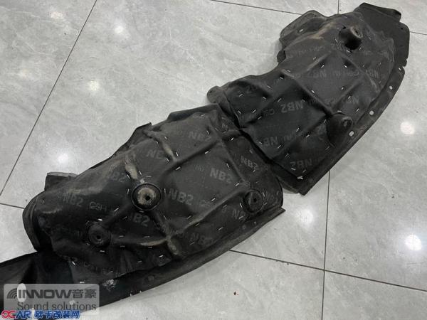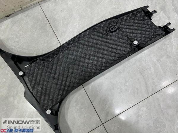 汽车行驶产生的路噪和胎噪,主要通过翼子板处传入到车厢内部。所以技师先使用CSH小炸弹对翼子板做了止振处理,减少了该部位的钣金共振;然后使用AC06棉对翼子板做隔音处理,减少噪声的传播;最后使用NB2棉做吸音处理。不仅如此,就连拆卸下来的翼子板内衬,技师也使用银卫盾对其做了止振处理,多层的施工,阻止了路噪和胎噪的传入。而为了减少外界噪声的传入,就连B柱技师也使用银卫盾和记忆棉,对其做了止振和吸音处理。