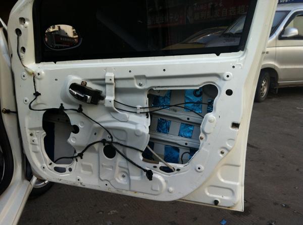 改装方案谈妥后马上开工,客户就是看中了我们的专业改装资质,没有犹豫!这是原车的门板,可以看出原来门板上面是没有喇叭的!