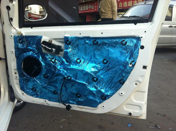 为了更好的发挥出喇叭的效果,改装之前对门板的加固是一个必不可少的环节!先对门板内外进行双层的隔音处理并选择好喇叭的安装位置!